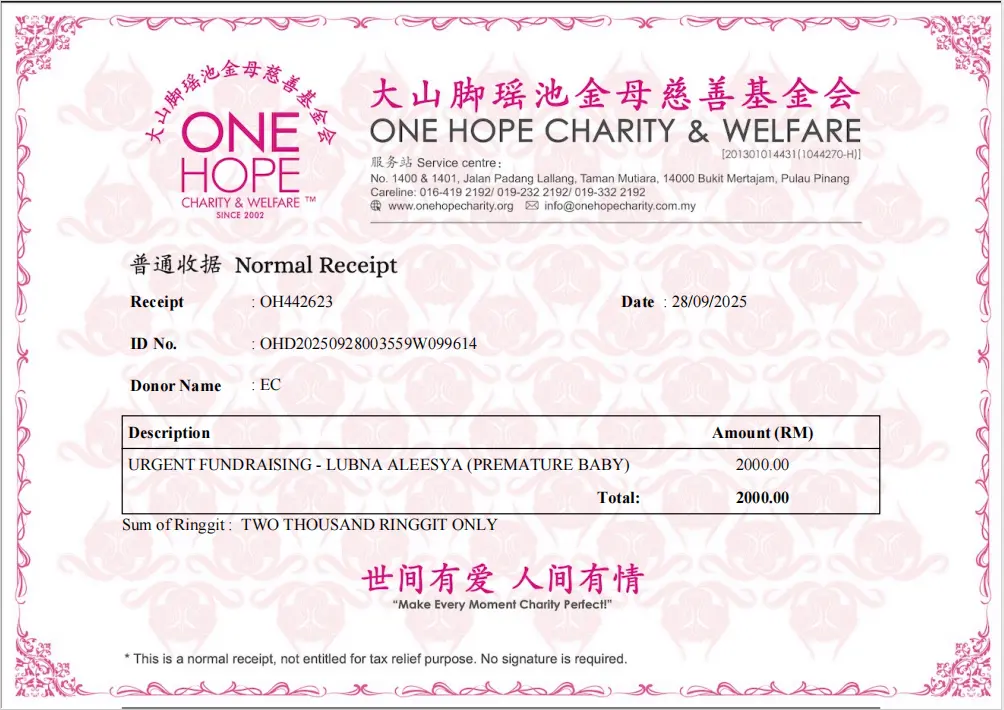 09/08/2021 Urgent Donation for HFNC breathing tube RM 10,000 more